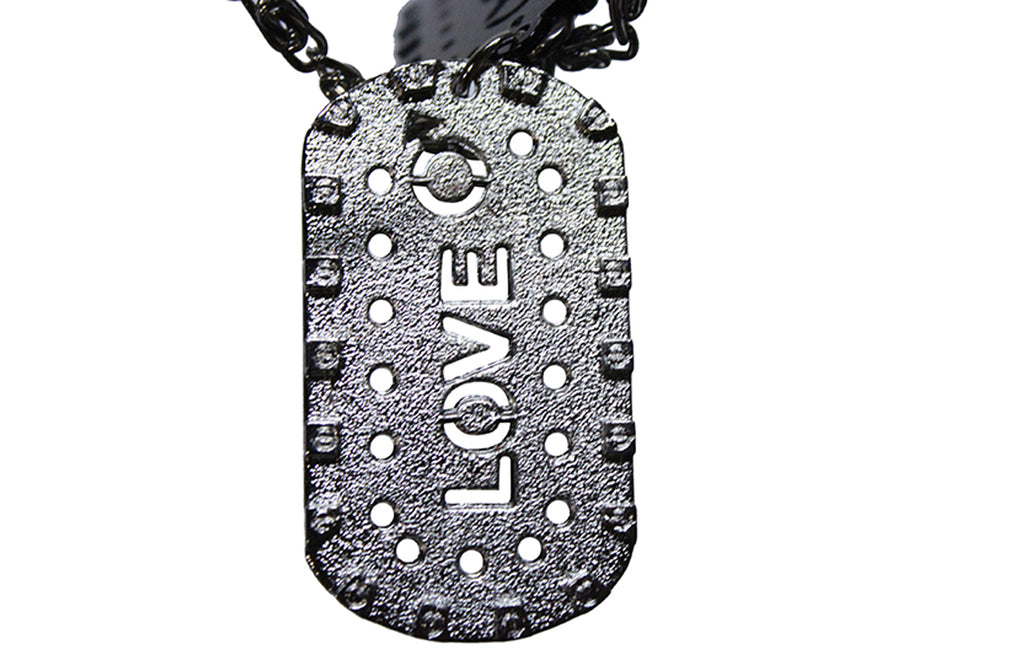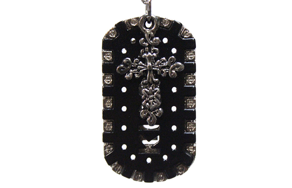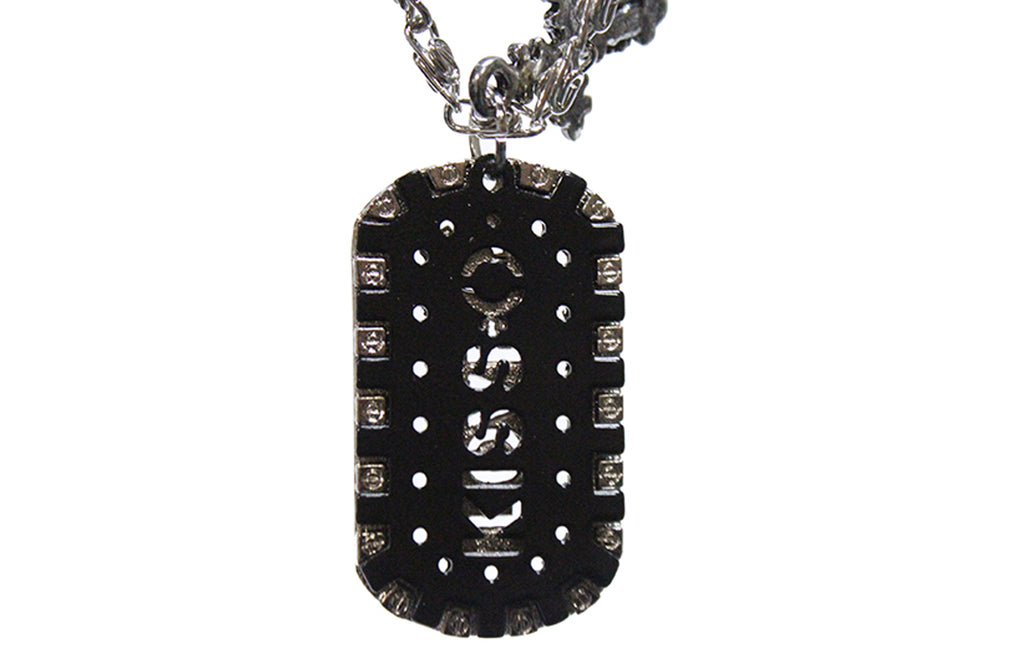 The two halves of this decorative dog tag come apart, with the letters KISS punched out of the black metal insert and the letters LOVE from the silver alloy backing. A simple 1 1/4" pewter cross dangles alongside and all three pieces attach to a 20" silver metal chain complete with a lobster claw clasp by a solid metal hoop. Our jewelry is made to look fantastic with both casual and formal wear. Order yours today.