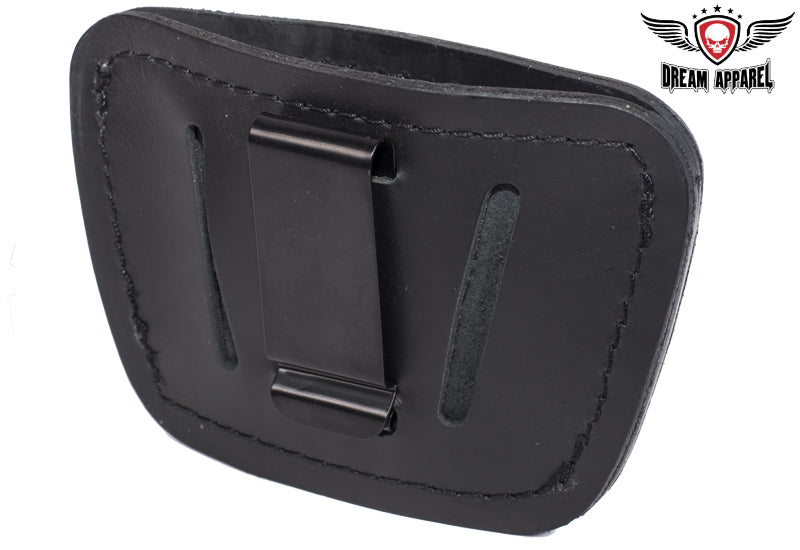 With this heavy duty leather carry clip pistol holster features removable metal clip on one side and belt loop on the other side. The clip is universal, so it will work either on left or right side and inside or outside of the waistband.
