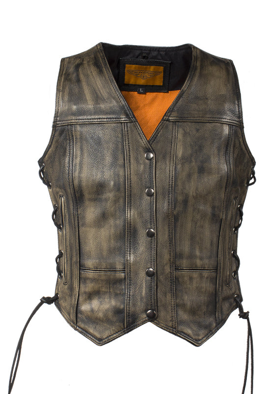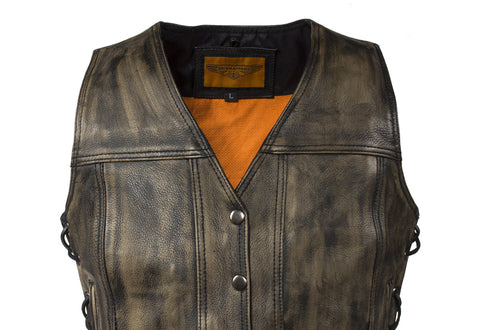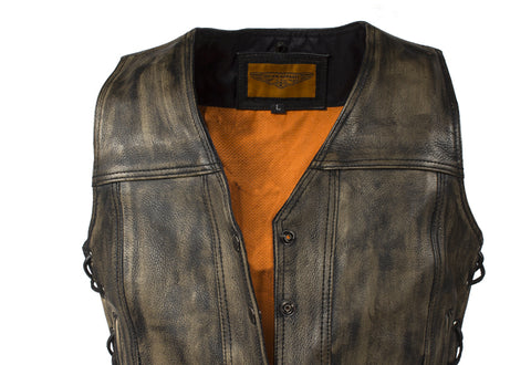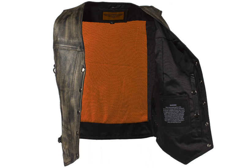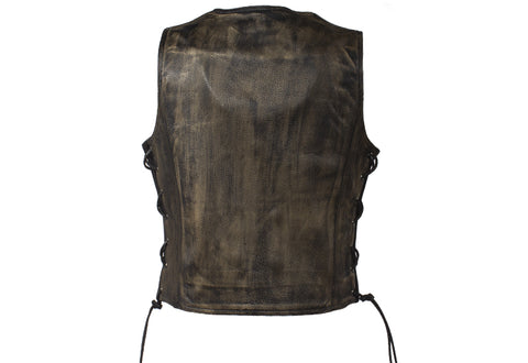 Enjoy the look and feel of our brown, heavy-duty, soft leather vest made with your personal protection in mind. Never ride alone with two deep concealed gun pockets, one on each side with double button-snap closures, and a slip pocket on the left inside for an extra clip. Make yourself comfortable with leather side laces for adjustable fit, a button-snap front closure, and a soft polyester and nylon lining. Bring along some extra items for the trip in two front stash pockets and two front pockets with zipper closures. Lastly, we left the back panel solid so that you could proudly display your club's colors and accomplishments making this incredible vest one that not only a smart choice but an amazing value.